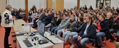 Beim Infoabend wurde das besondere Profil von FOS und BOS deutlich: Die Fachpraktische Ausbildung als Alleinstellungsmerkmal an der Fachoberschule, ein „Abitur hoch drei“ in Bezug auf den Abschluss, zahlreiche Brückenangebote wie Vorkurse, Vorklassen und Förderunterricht oder die Individualität mit Wahlmöglichkeiten und Semesterprinzip. Trotz einer maximalen Bestuhlung mit 180 Plätzen im Großraum blieben für einige interessierte künftige FOS-Schüler und deren Eltern nur mehr Stehplätze bis hinaus in den Gang. Zeitgleich gab es in der Eingangsaula des Erweiterungsbaus die Informationen für die BOS.