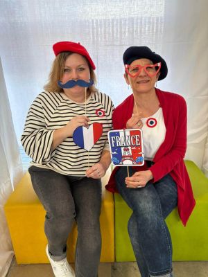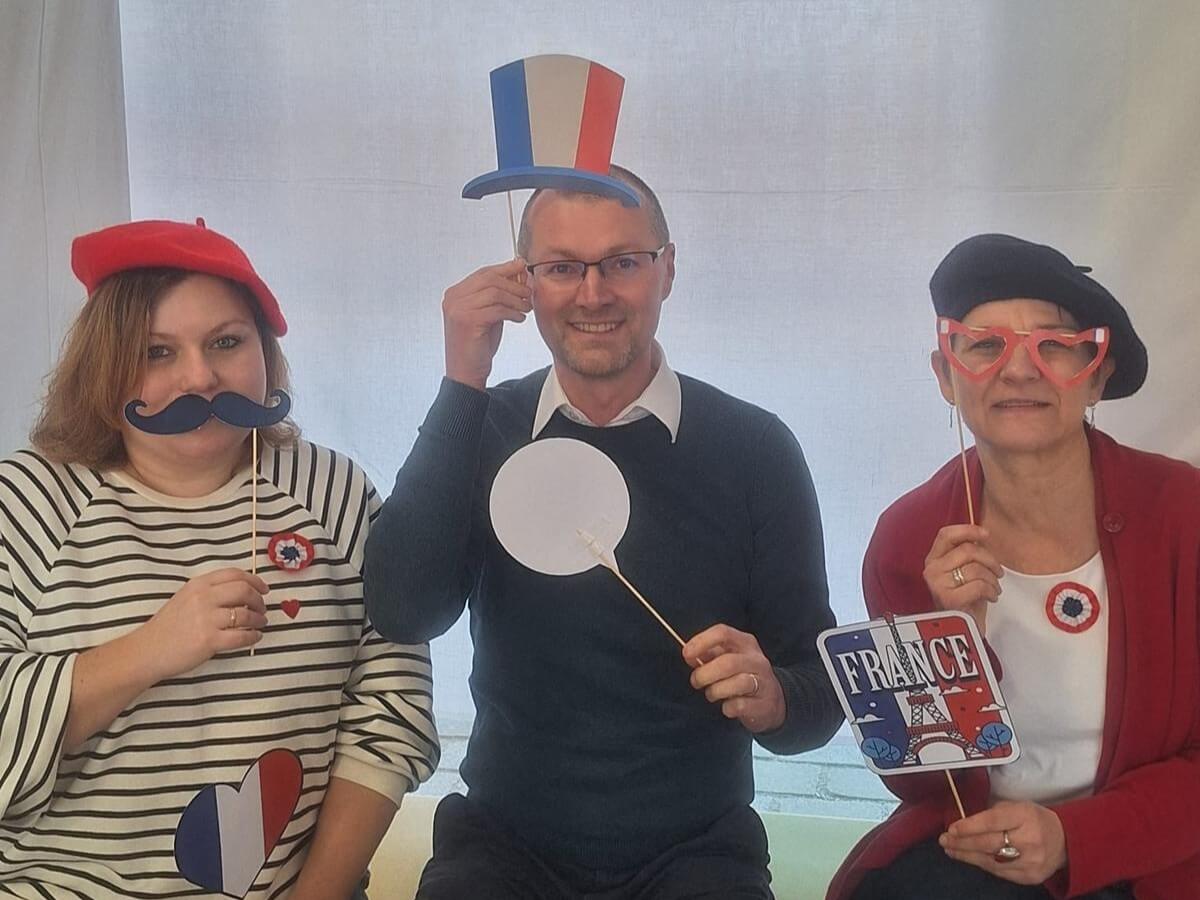 Ein besonderes Highlight feierte dieses Jahr Premiere: die selbstgestaltete Fotobox. Ausgestattet mit witzigen Accessoires, Frankreich‑Motiven und viel Charme lud sie die Schulgemeinschaft zu spontanen, fröhlichen und teilweise herrlich verrückten Erinnerungsfotos ein. Sie wurde auch von unserem Kooperationsbesuch aus der Marienrealschule begeistert genutzt und es entstand eine kleine Sammlung an echten Momentaufnahmen, die noch lange an diesen Tag erinnern werden.