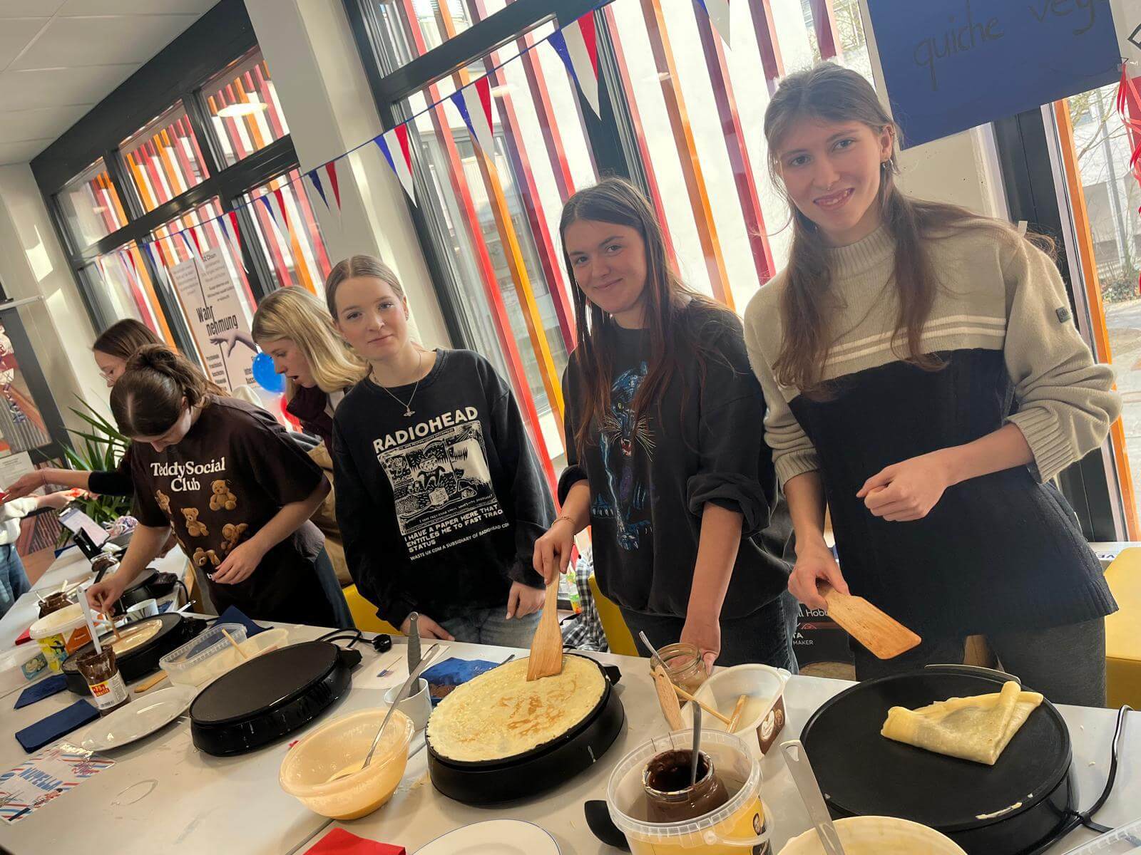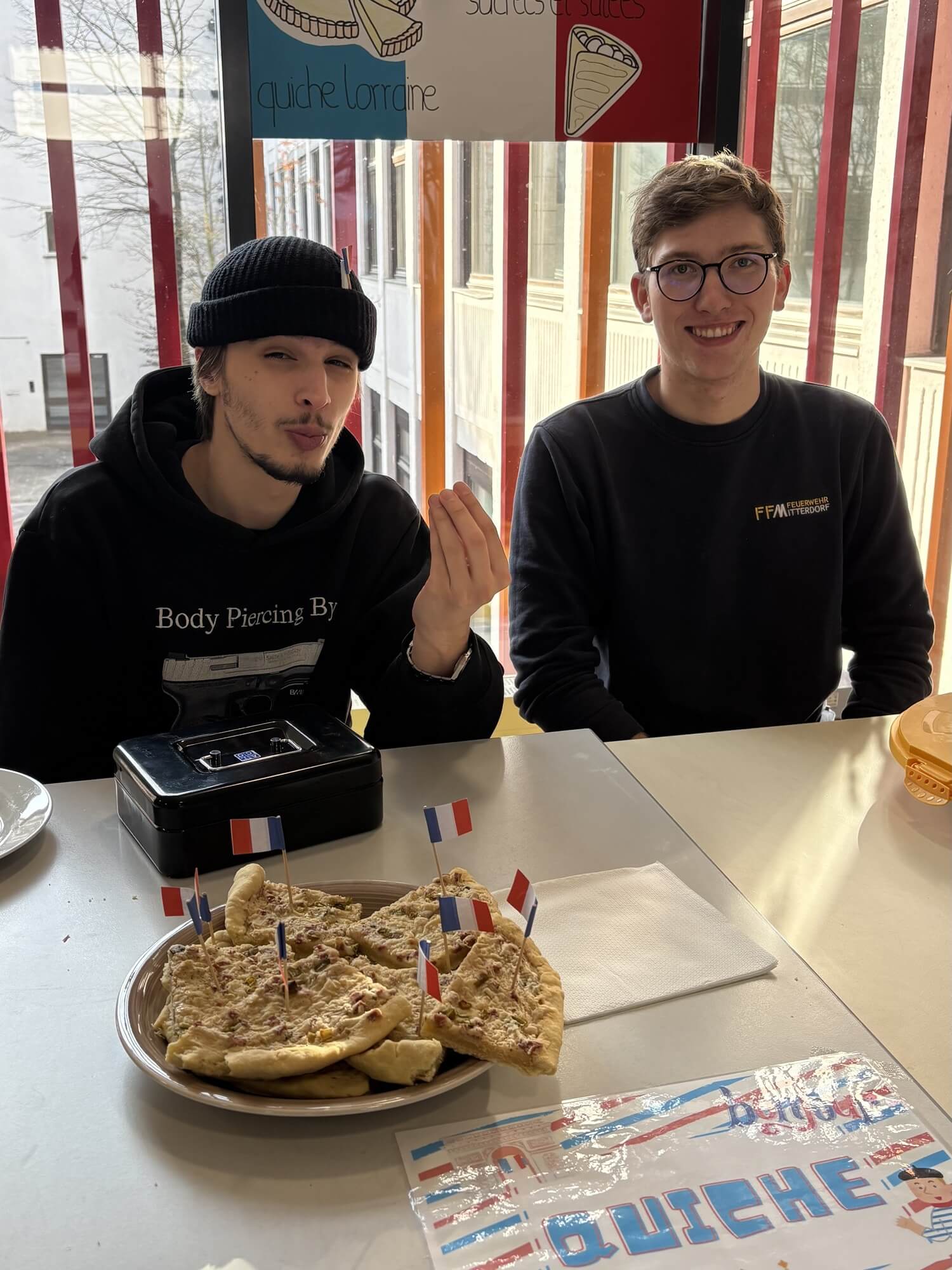 Wie jedes Jahr wurde der Tag am 22. Januar gefeiert, anlässlich der Unterzeichnung des Elysée‑Vertrags, mit dem 1963 die deutsch‑französische Freundschaft besiegelt wurde. Die Schüler der Französischkurse trafen sich bereits hochmotiviert am Vortag in der Schulküche der Berufsschule, um Quiches vorzubereiten und mit viel Gelächter und ein wenig Mehlwirbel das Drehen perfekter Crêpes zu üben. Denn wie alle mittlerweile wissen: Die französische Spezialität verlangt Fingerspitzengefühl. Die Französischschüler hatten den Dreh aber schnell heraus und die Handgriffe sitzen inzwischen wirklich fast professionell. Und wenn doch einmal ein Crêpe zu dünn oder zu dick geriet, wurde er kurzerhand mit Humor und Kreativität gerettet. So zeigte sich wieder, wie viel Freude gemeinsames Arbeiten und eine Prise französische Gelassenheit bereiten können.