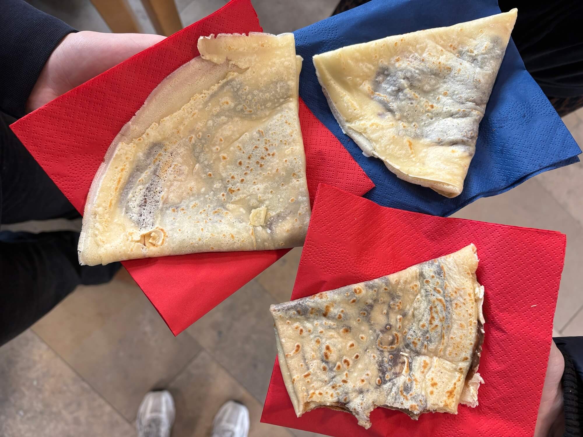 Am Aktionstag selbst duftete es schon früh im ganzen Schulhaus, und sich in Geduld bis zur 6. Stunde bzw. Mittagspause zu üben, war gar nicht so einfach. Schließlich war es aber so weit und an den Crêpes-Stationen bildeten sich rasch Schlangen, um die verschiedenen Angebote zu testen. Eine von den Schülern zusammengestellte Playlist mit französischen Hits sorgte zusätzlich für gute Laune unter allen Wartenden. Und auch mit einem Frankreich-Quiz oder einem Wörter-Memory konnte man sich die Zeit gut vertreiben und ganz nebenbei Interessantes über Frankreich erfahren.