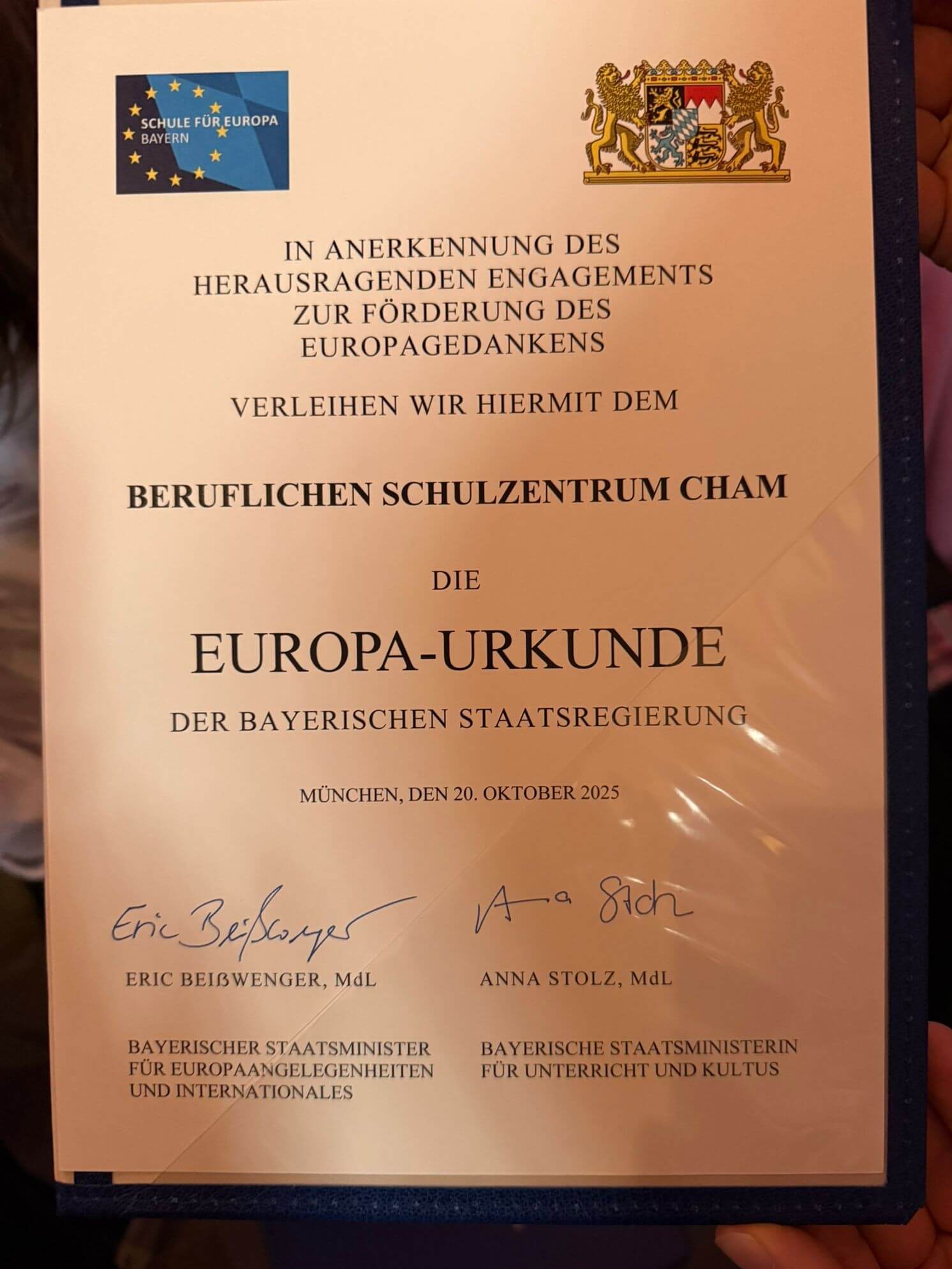 Mit dieser Auszeichnung würdigt die Bayerische Staatsregierung Schulen, die sich in besonderer Weise für das europäische Bewusstsein, internationale Zusammenarbeit und interkulturelles Lernen einsetzen. In einer feierlichen Veranstaltung in der Allerheiligen-Hofkirche der Residenz München nahm eine Delegation des BSZ Cham – bestehend aus den Lehrkräften Josef Bachmeier, Anja Nichtl, Michaela Schedlbauer und Martin Stauber – die Urkunde stellvertretend für die gesamte Schulgemeinschaft entgegen.