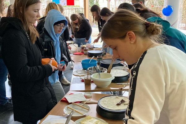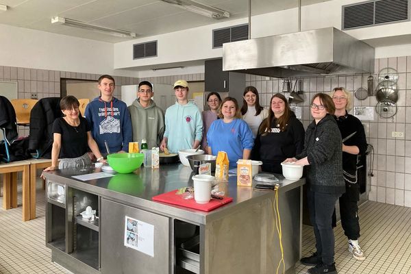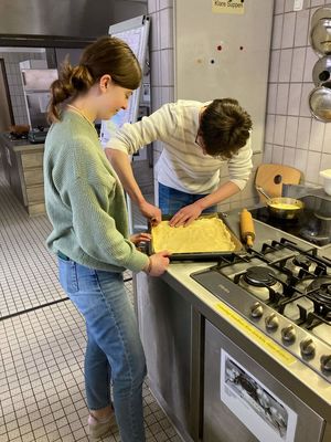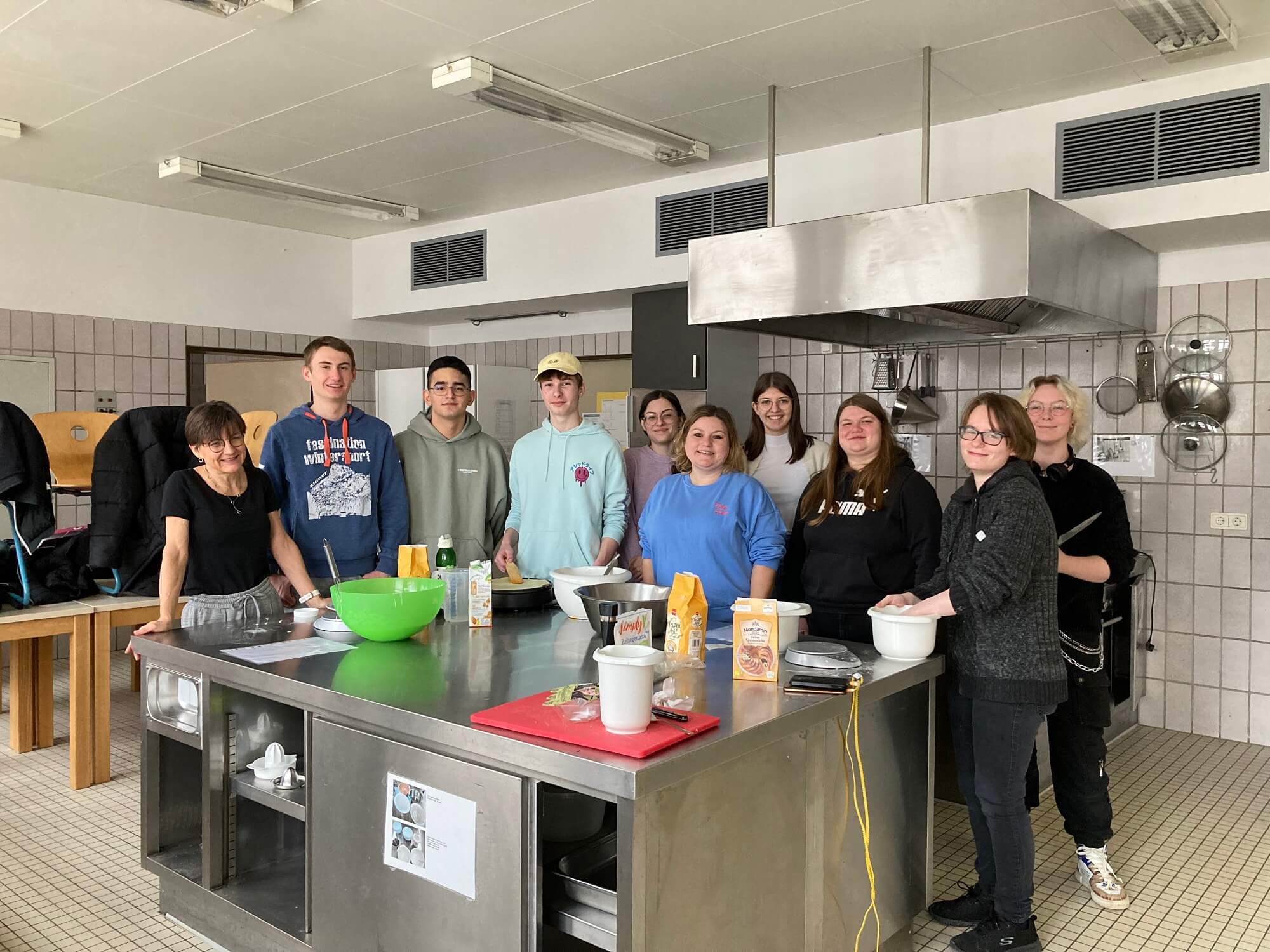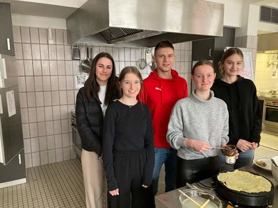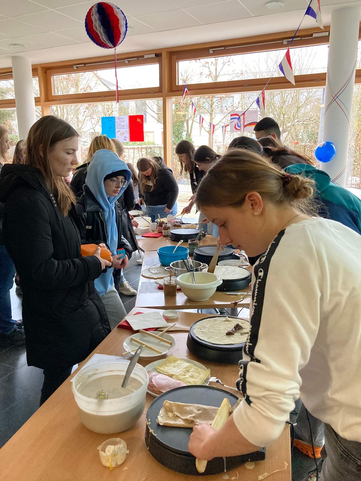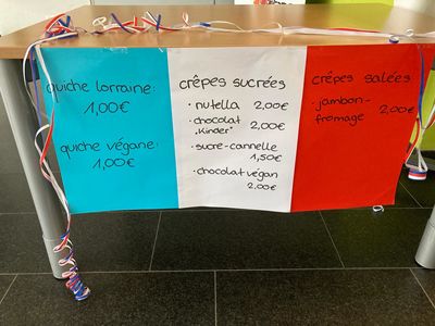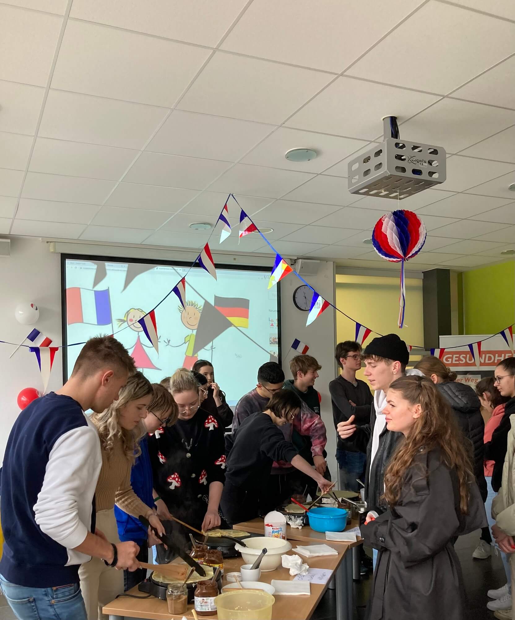 Doch die Vorbereitungen für diesen Tag beschränkten sich nicht nur auf Dekoration und den Verkauf der französischen Leckereien. Schon am Vortag trafen sich die Schüler, die Französisch entweder als zweite Fremdsprache für das Allgemeine Abitur belegen oder im Rahmen des angebotenen Wahlpflichtfachs ihre bereits in den Vorgängerschulen erlangten Kenntnisse noch ausbauen wollen, in der Schulküche. Dort wurden die Quiches in den Versionen klassisch und vegan für den nächsten Tag gebacken und dank der Erfahrung aus dem letzten Jahr wurde auch fleißig das Crêpes-Zubereiten geübt. Denn das Herstellen der französischen Spezialität ist gar nicht so einfach!