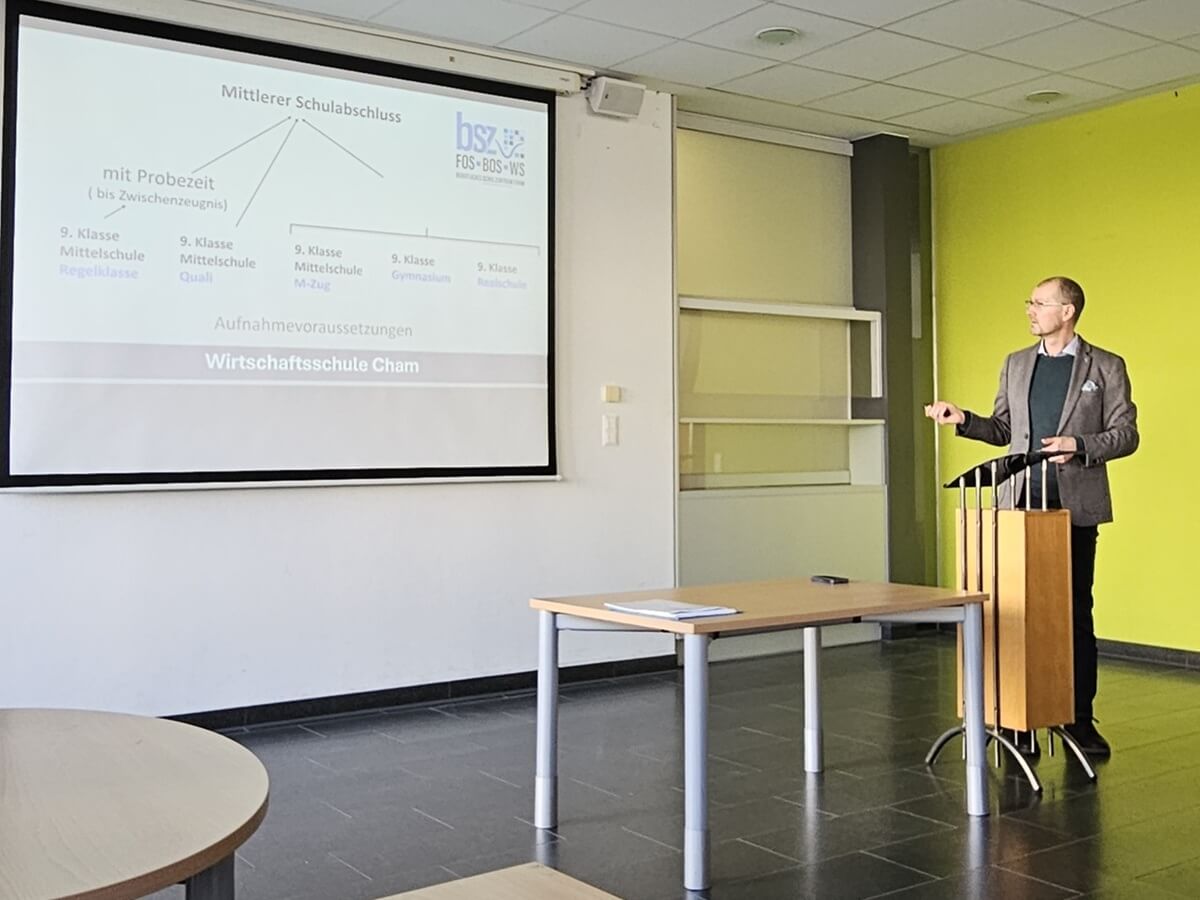 Ende Februar lud die zweistufige Wirtschaftsschule Cham zum Informationsvormittag ein. Schulleiter Joachim Raab begrüßte die trotz des sommerlichen Wetters relativ zahlreiche Eltern mit ihren Kindern, den zukünftigen Schülerinnen und Schülern. Er gab einen Überblick über die Neukonzeption der Wirtschaftsschule und informierte über die Anforderungen zur Aufnahme und zum erfolgreichen Durchlaufen dieser zweijährigen Schulart, die einen hochwertigen mittleren Schulabschluss bietet. Außerdem legte er auch dar, welche vielfältigen Berufs- oder Weiterbildungsmöglichkeiten die Wirtschaftsschule bietet. Mit der FOS im gleichen Haus ist sie auch der ideale Zubringer zum Fachabitur oder sogar der allgemeinen Hochschulreife.