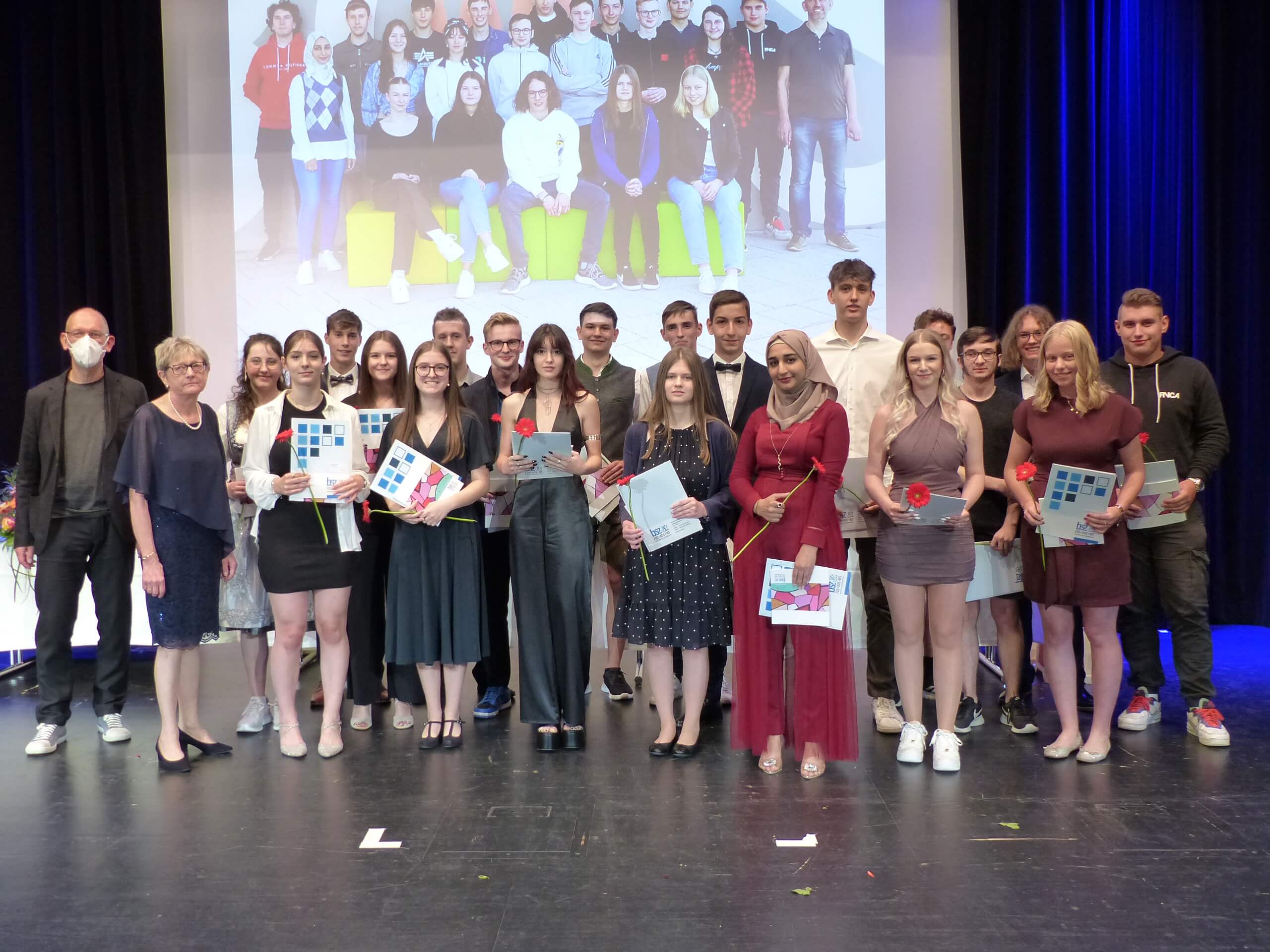 189 Absolventen haben ihr Fachabitur bzw. Abitur bestanden. Davon erhielten 145 nach der 12. Klasse ihr Fachabitur ausgehändigt. 44 Schüler der 13. Jahrgangsstufe konnten das Zeugnis über die fachgebundene Hochschulreife entgegennehmen und von diesen erhielten wiederum 27 die allgemeine Hochschulreife zuerkannt, da sie eine zweite Fremdsprache vorweisen können. Von den diesjährigen Fachabiturienten bleiben weiterhin 54 der Schule treu, um im nächsten Schuljahr 2022/2023 in der 13. Jahrgangsstufe die fachgebundene oder allgemeine Hochschulreife zu erwerben.