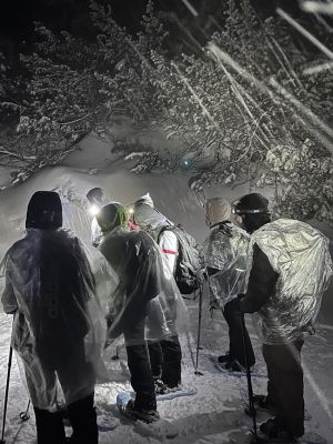 Zum ersten Mal in der zehnjährigen Geschichte dieser Veranstaltung gab es dieses Jahr Dauerregen am Großen Arber – und das mitten im meteorologischen Winter. Frei nach dem Motto „Es gibt kein schlechtes Wetter, nur schlechte Kleidung“ zogen die Teilnehmer die schuleigenen Regenponchos über ihre Jacken. Ausgerüstet mit Stirnlampen und Schneeschuhen wanderten die FOS- und BOS-Schüler in der Dunkelheit durch den Arberwald. Zwischendurch peitschte der böhmische Ostwind ihnen kräftig ins Gesicht, sodass ein fast arktisches Outdoor-Feeling aufkam. Ohne zu jammern und mit großem Ehrgeiz ließen sich die Wanderer nicht von ihrem Kurs abbringen und freuten sich, als sie das Licht des Arberschutzhauses am Gipfel sahen. Motiviert durch den Gedanken an eine warme Gaststube und eine stärkende Brotzeit setzten die Schneeschuhwanderer zum Endspurt an.
