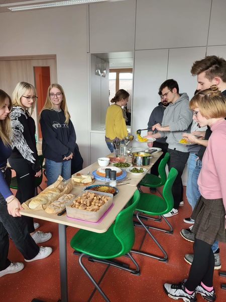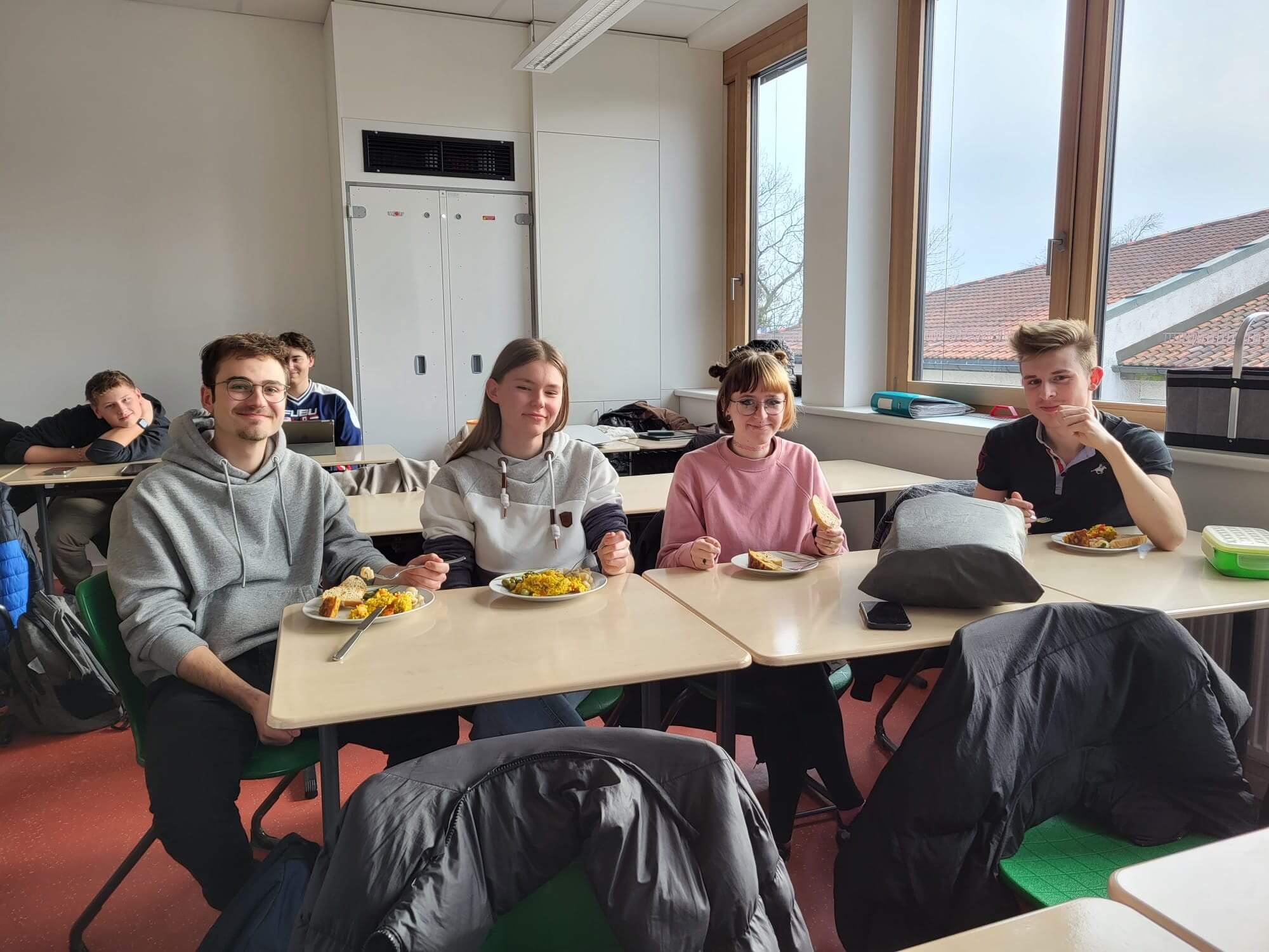 Wer denkt, dass Spanischunterricht nur aus Vokabel- und Grammatikpauken besteht, hat weit gefehlt. Spanisch ist so viel mehr! Das durften auch die Spanischschüler der 12. Klassen erfahren. Sie tauchten nämlich in einer Doppelstunde tief in die spanische Esskultur ein. Mit großem Interesse haben die Schüler und Schülerinnen diese Abwechslung willkommen geheißen und sich in der Vorstunde Rezepte ausgesucht, die sie dann zuhause selbst zubereiteten. Der Spanischkurs staunte nicht schlecht, als die Tische im Klassenzimmer zu einem Tapas-Buffet umfunktioniert wurden und die Schüler ihre Tapas auffuhren.