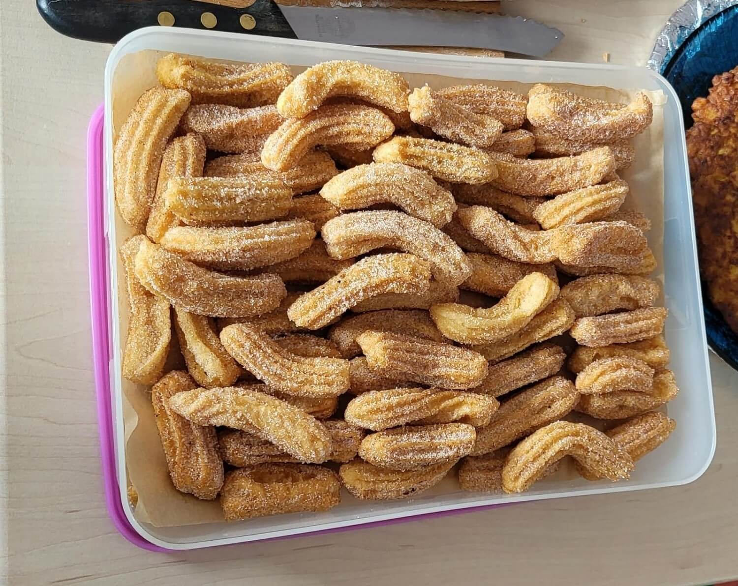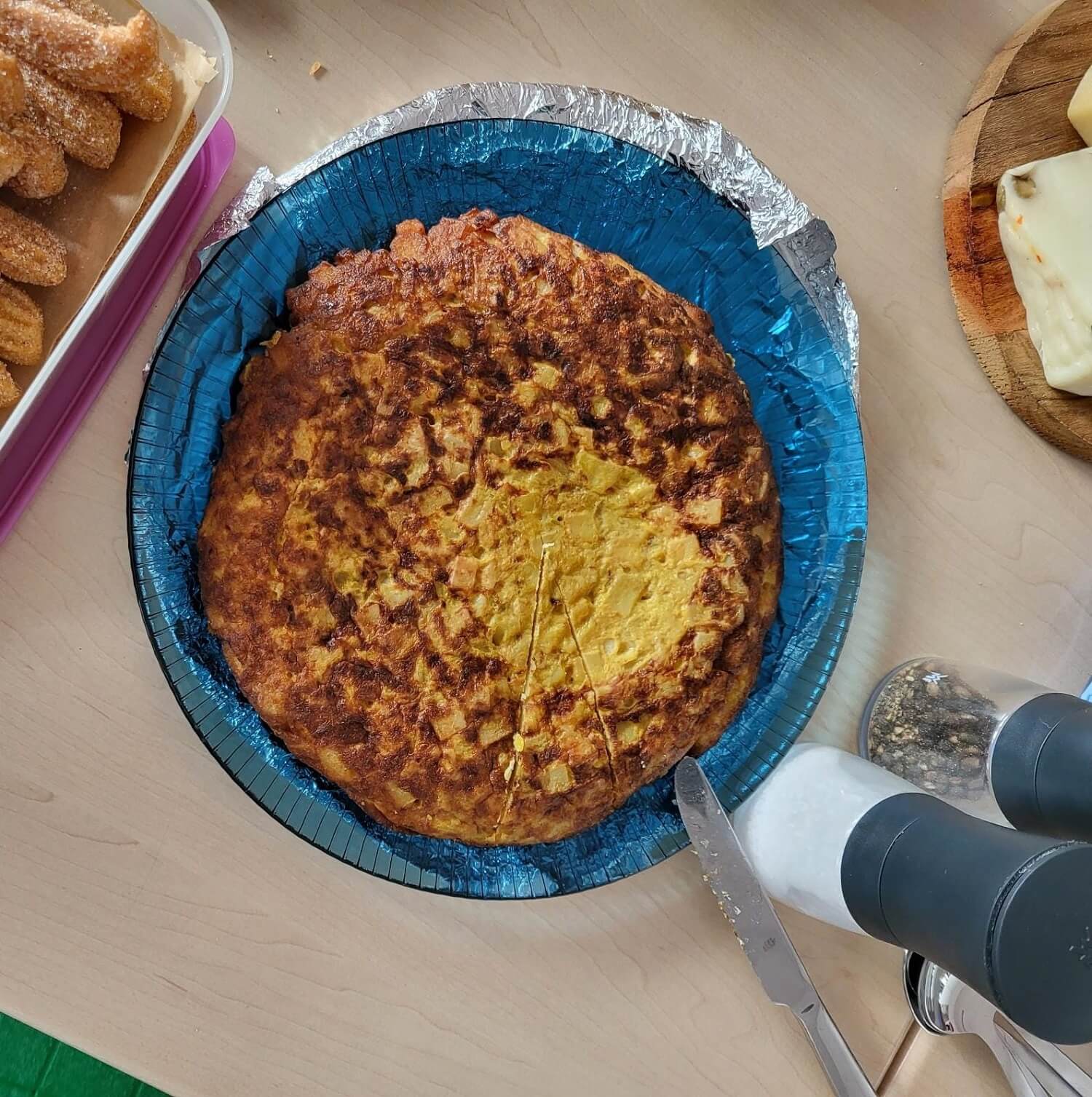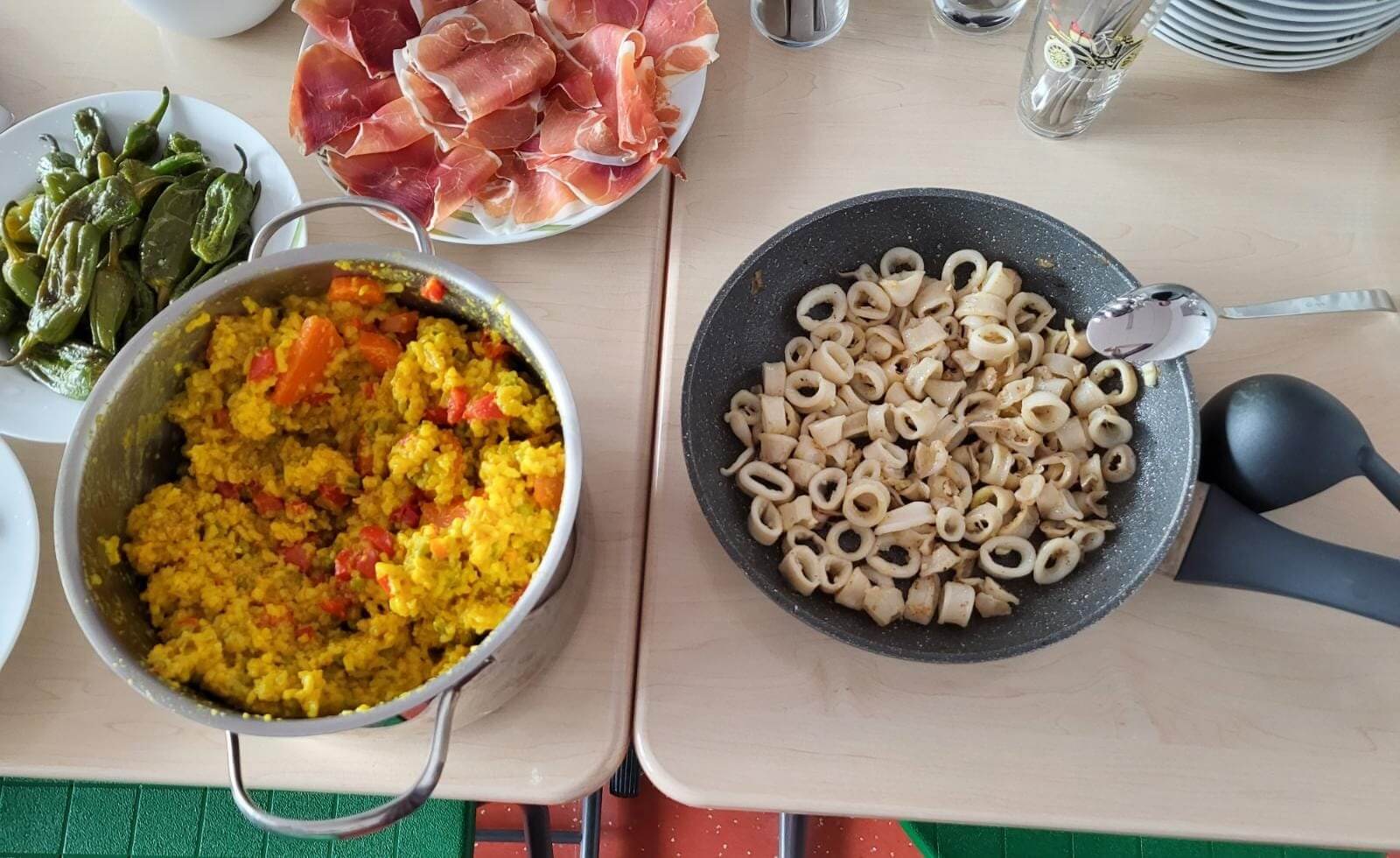 Die Bandbreite war groß und umfasste in einem ersten Gang die unterschiedlichsten salzigen Speisen: Zum Beispiel gabe es Pimientos de Padrón, eine grüne Paprikasorte mit Salz und Knoblauch, Paella de marisco, als Reispfanne mit Meeresfrüchten bekannt, oder Tortillas, eine Art Kartoffelomelette. Als Nachspeise wurden zwei typisch spanische Süßspeisen von den Schülern zubereitet: Nämlich das Spritzgebäck Churros und der Mandelkuchen Tarta de Santiago. Es wurde also ordentlich aufgetischt!