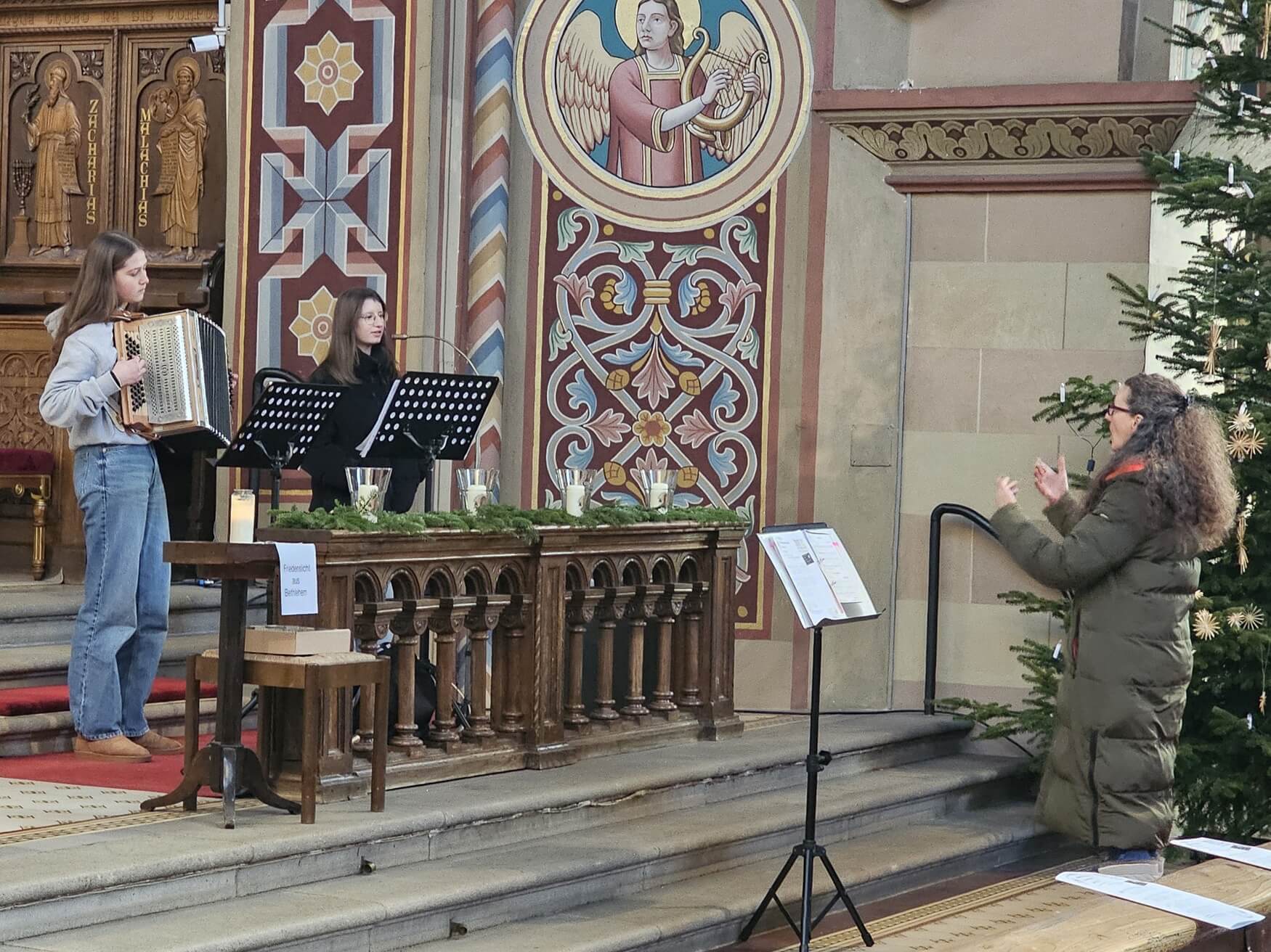 Auch die Schüler brachten sich eifrig ein, etwa mit dem Entzünden von Kerzen oder bei den Fürbitten. Wie jedes Jahr wurde im Rahmen der Adventsandacht eine Kollekte durchgeführt, die wieder ins Heilige Land geht. Für eine wunderbare Begleitung und Umrahmung sorgten Musikpädagogin Lisa Montag sowie die beiden FOS-Schülerinnen Lisa Lohberger (Gesang) bzw. Jana Neuberger (Steirische). Als Schlusslied stimmten alle gemeinsam „Leise rieselt der Schnee“ an.