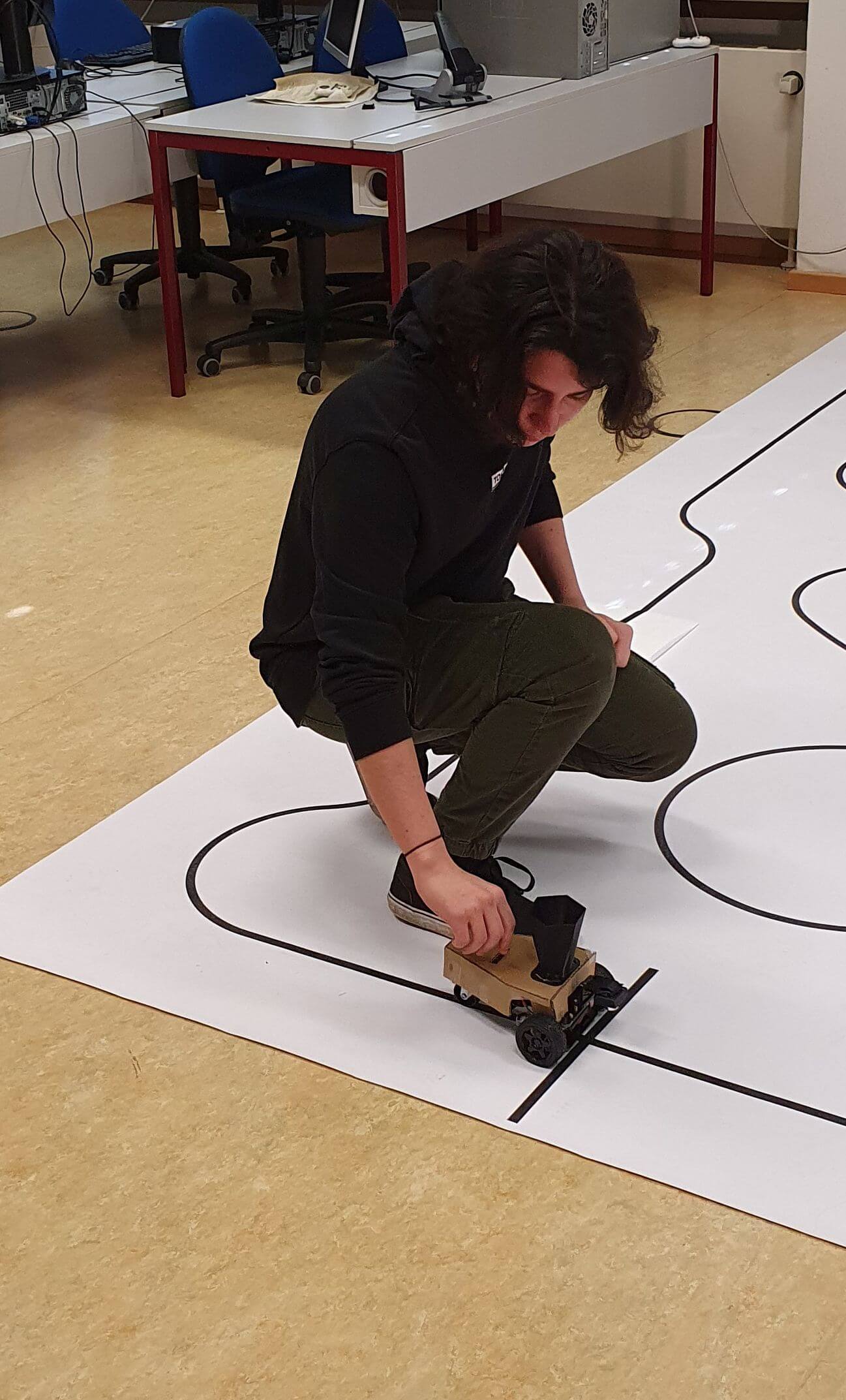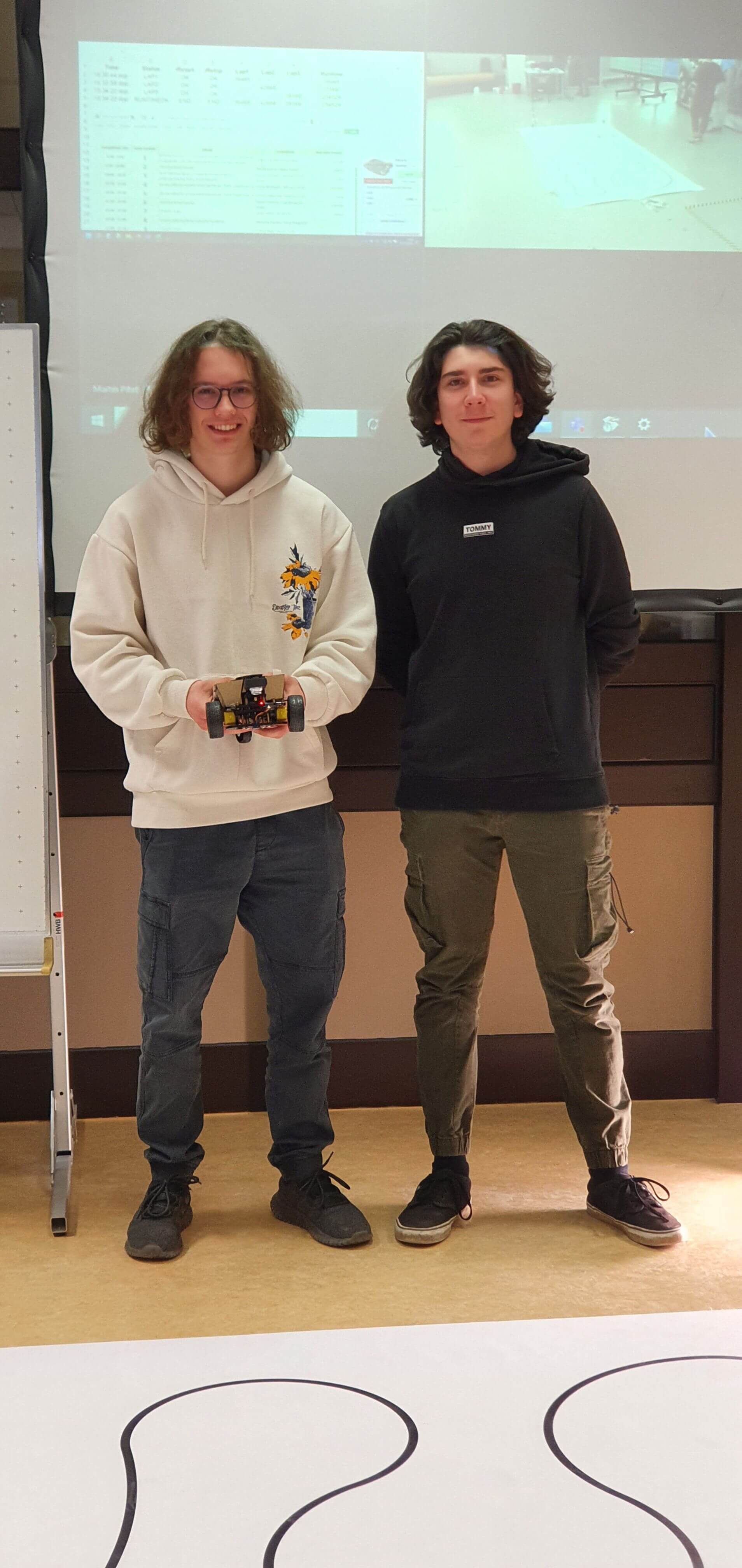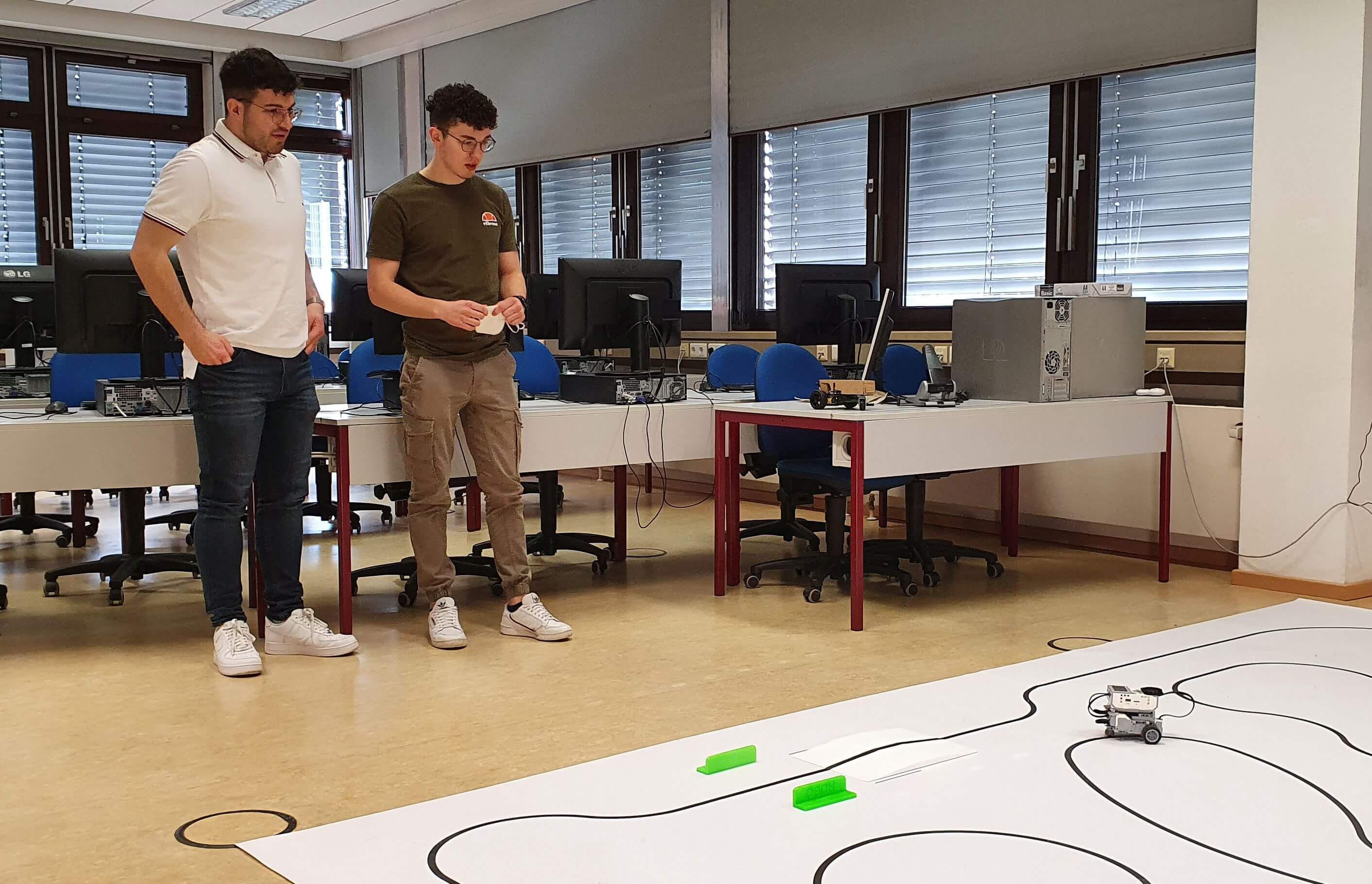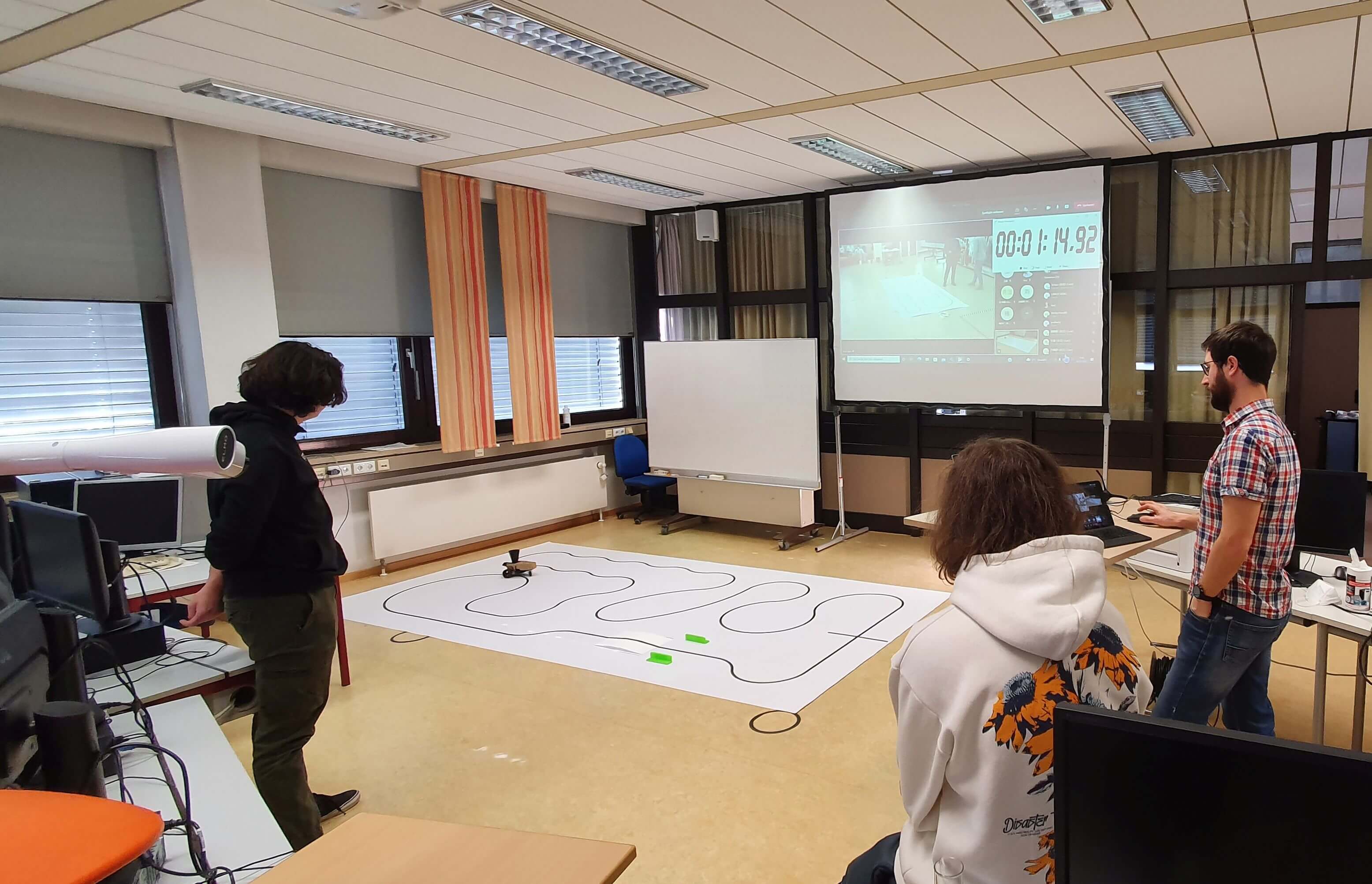Als letztes und spannendstes Ereignis wurde die Zeit gewertet, die der Roboter brauchte, um die auf einer zwei mal drei Meter großen Folie aufgebrachte eineinhalb Zentimeter breite Linie einmal abzufahren. Der von den Chamer Schülern programmierte Algorithmus arbeitete mit den ausgiebig getesteten Standardparametern zuverlässig und so konnten beide eingesetzten Roboter die Strecke auf Anhieb sicher durchfahren. Die letztjährigen Rundenzeiten konnten dabei auf knapp die Hälfte reduziert werden.